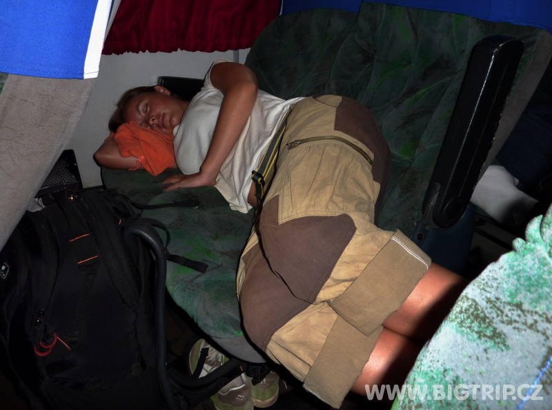 Cesta autobusem je docela snesitelná. Díky ne příliš obsazenému busu okupujeme každý několik sedaček a tak se v celku i pohodlně spí. V polovině cesty nám dokonce mění autobus za luxusní "zájezďák" a tak jízda přes noc utíká jako voda.