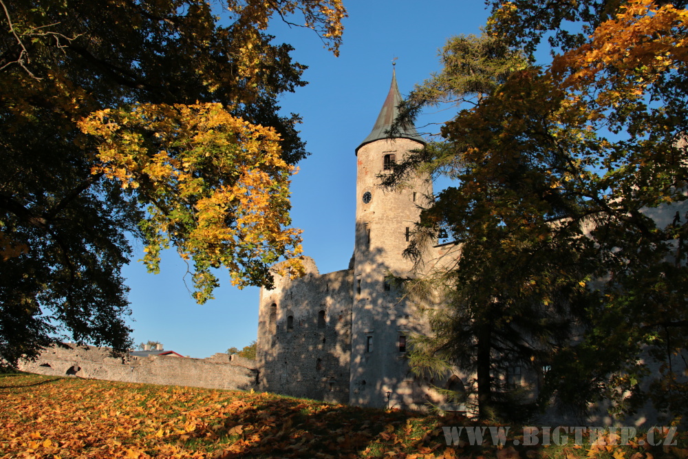 Projíždíme nevelikým městečkem až na konec hlavní silnice, která končí parkovištěm u zříceniny zdejšího zámku. Okamžitě vybíháme na průzkum. Slunce těsně před západem nám celý areál zbarvuje do oranžova a spadané listí je ještě barevnější.