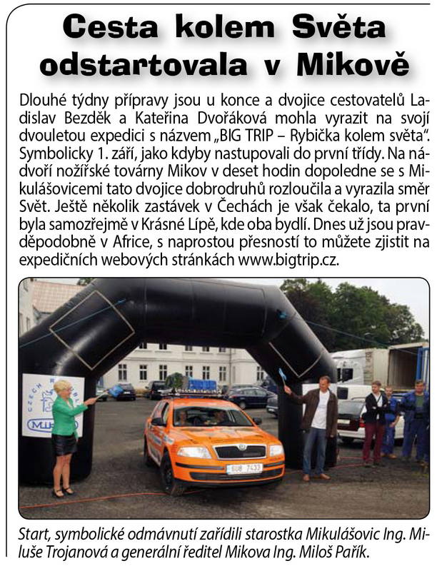 Krátký článek o naší výpravě kolem světa byl vytištěn i v Mikulášovických novinách. Aby ještě ne, když naše cesta právě odstartovala od společnosti Mikov, která sídlí právě v Mikulášovicích. :-)
